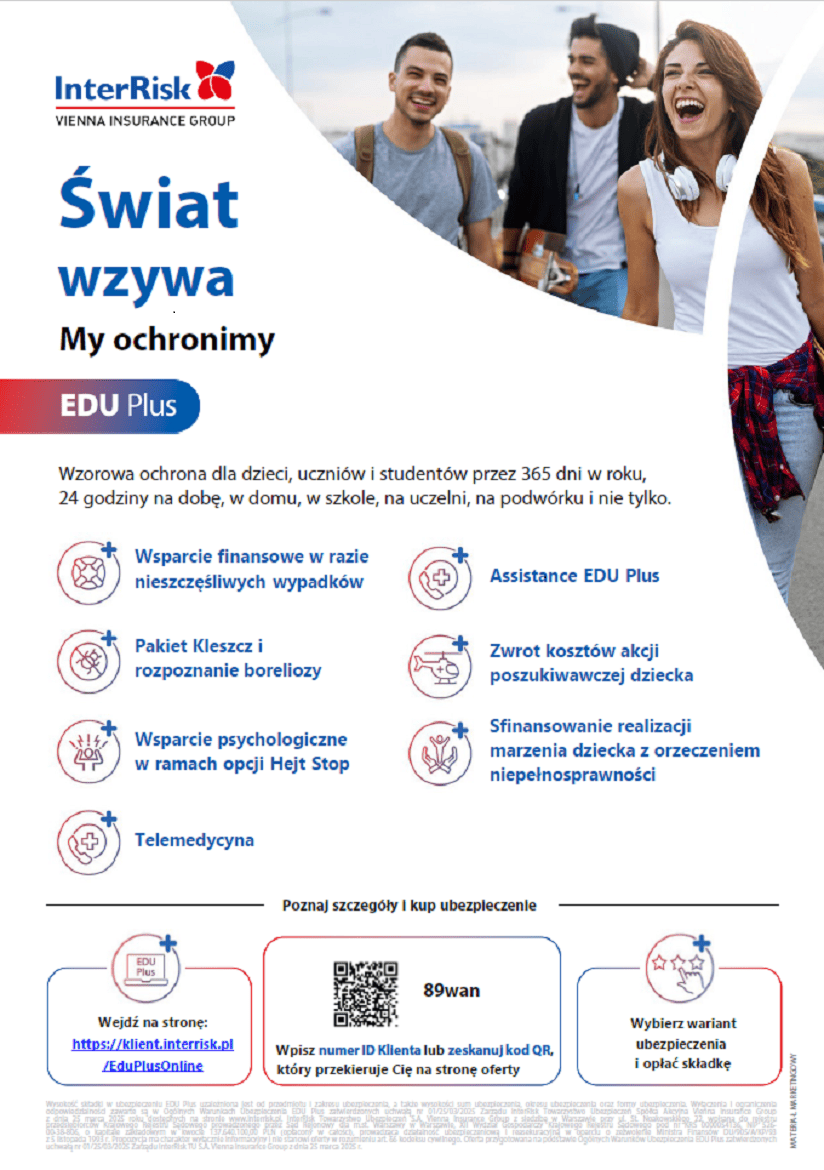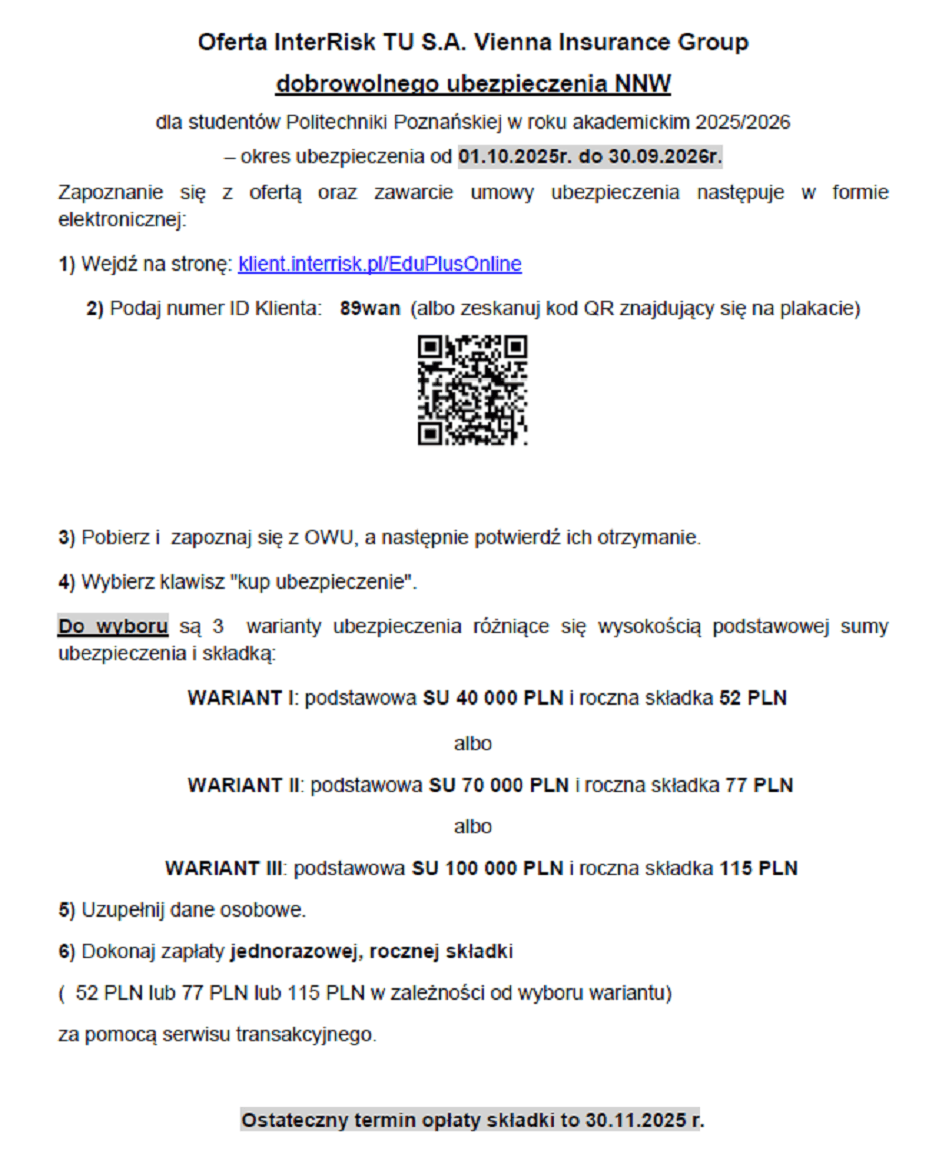 Oferta InterRisk TU S.A. Vienna Insurance Group dobrowolnego ubezpieczenia NNW dla studentów Politechniki Poznańskiej w roku akademickim 2025/2026